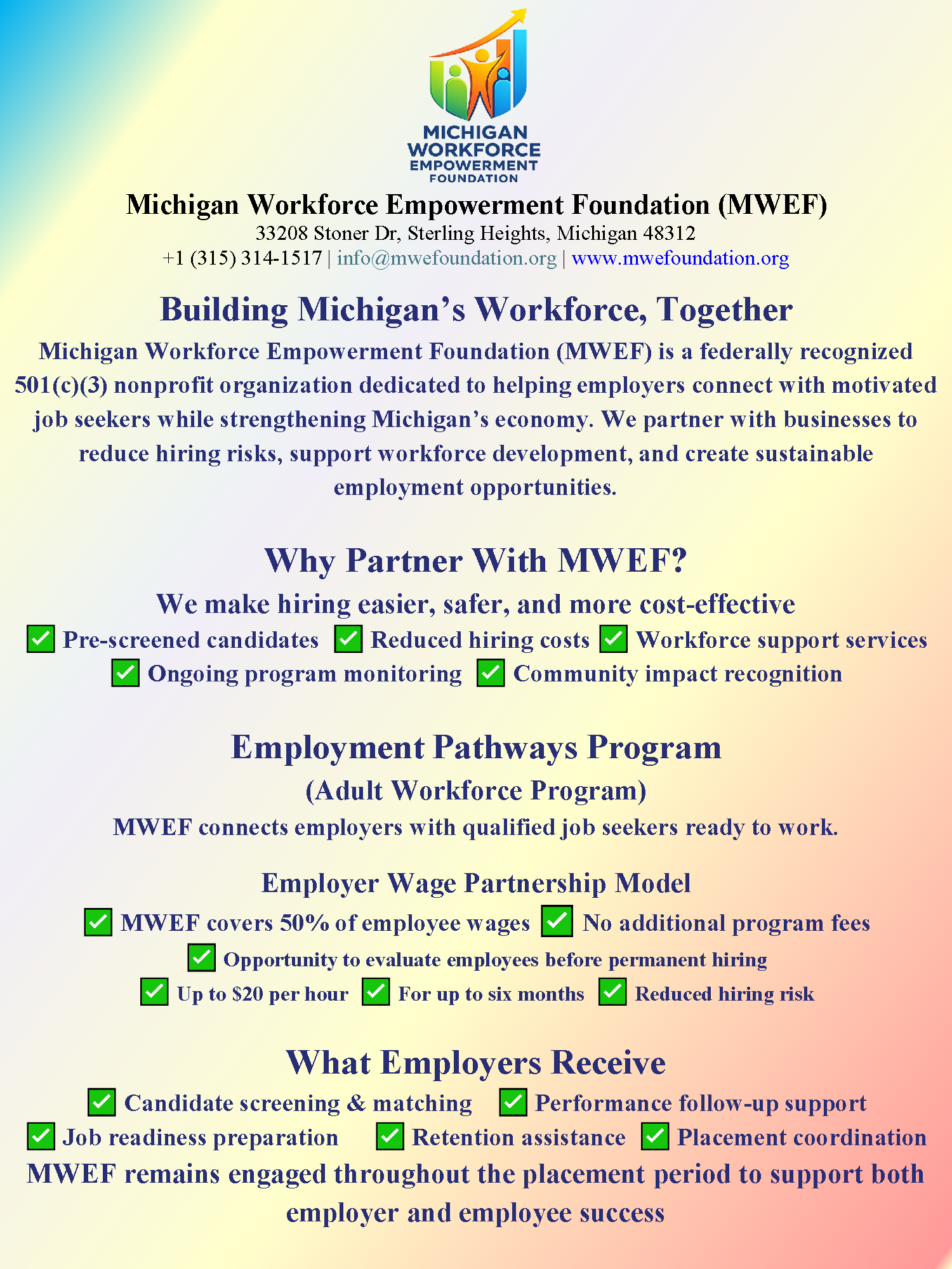 Michigan Workforce Empowerment Foundation (MWEF) is a nonprofit organization recognized as tax-exempt under Section 501(c)(3) of the Internal Revenue Code.